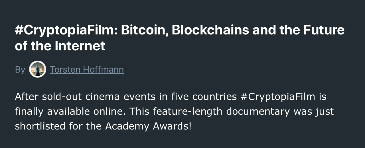 This week filmmaker Torsten Hoffmann launched the cryptocurrency-infused documentary “Cryptopia: Bitcoin, Blockchains and the Future of the Internet.” Cryptopia discusses the powerful economy and flourishing ideas that stemmed from Satoshi’s invention through the eyes of some of the industry’s well known movers and shakers.