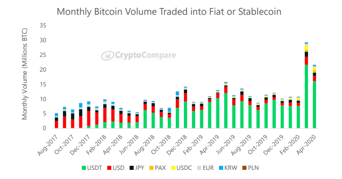 Following the large drop in Bitcoin and other cryptocurrencies in March and largely fueled by the coronavirus outbreak, BTC trading into USDT has decreased 26% from 21.6 million to 16.1 million BTC in April.
