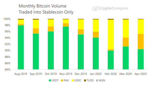 Other stablecoins like USDC, PAX and TUSD lag behind, with USDC having a market capitalization of $707.64 million. USDT is also the most popular BTC pair and comprised an overwhelming majority of 74% of the total Bitcoin traded into fiat or stablecoin in April.