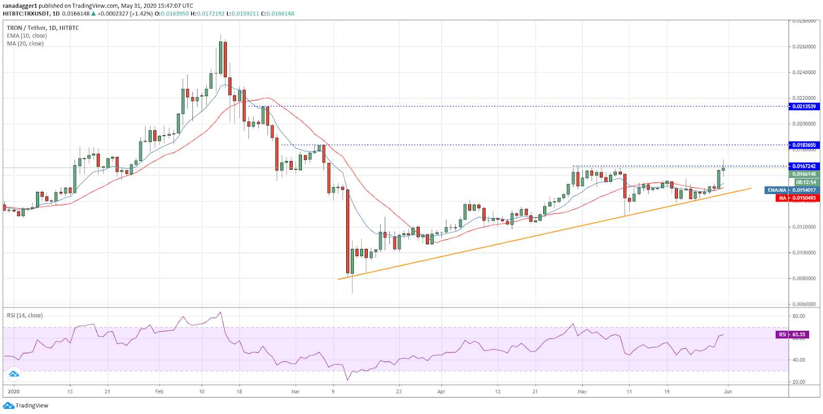 Tron (TRX) broke out of the critical overhead resistance of $0.0167242, which is a huge positive because between April 29-May 9 the bulls had repeatedly failed to do so.