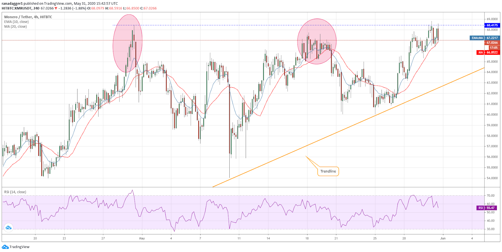 Monero (XMR) has reached the critical overhead resistance of $68.4175. The price had turned down from close to this level twice before, hence, this level is likely to act as a major barrier.