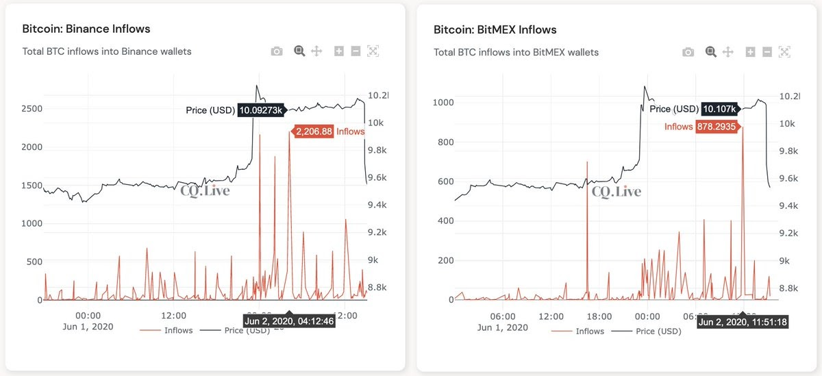“Multiple significant BTC inflows from Binance and BitMEX a few hours before the dip.”