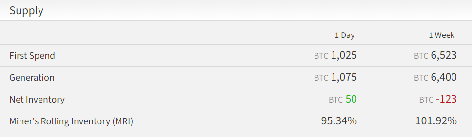 Miners have sold 673 more BTC than they have mined from May 25 until May 31, resulting in a Miner’s Rolling Inventory (MRI) of 111.44%.