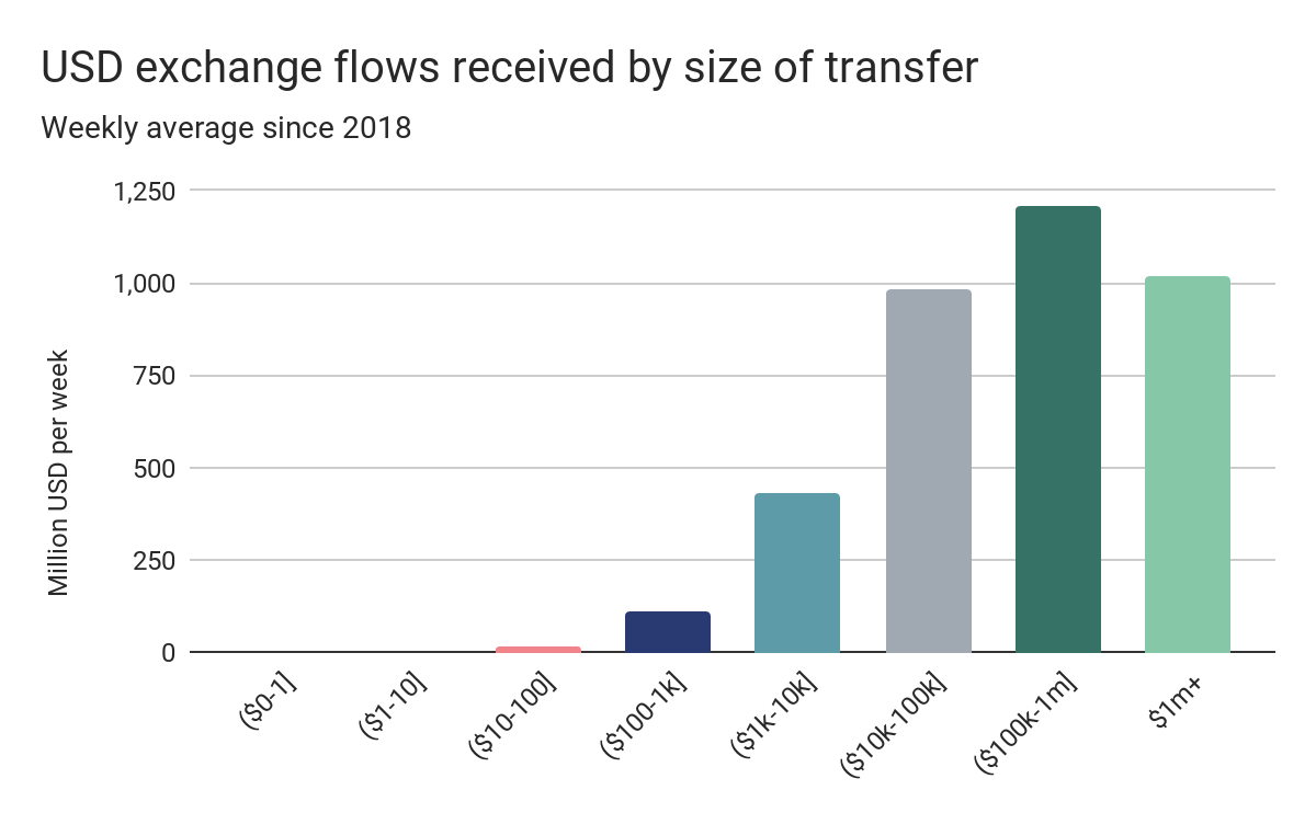“Retail traders, whom we categorize as those who deposit less than $10,000 USD worth of Bitcoin on exchanges at a time, appear to be the large majority, accounting for 96% of all transfers sent to exchanges on an average weekly basis. Professional traders, however, control the liquidity of the market, accounting for 85% of all the USD value of Bitcoin value sent to exchanges.”