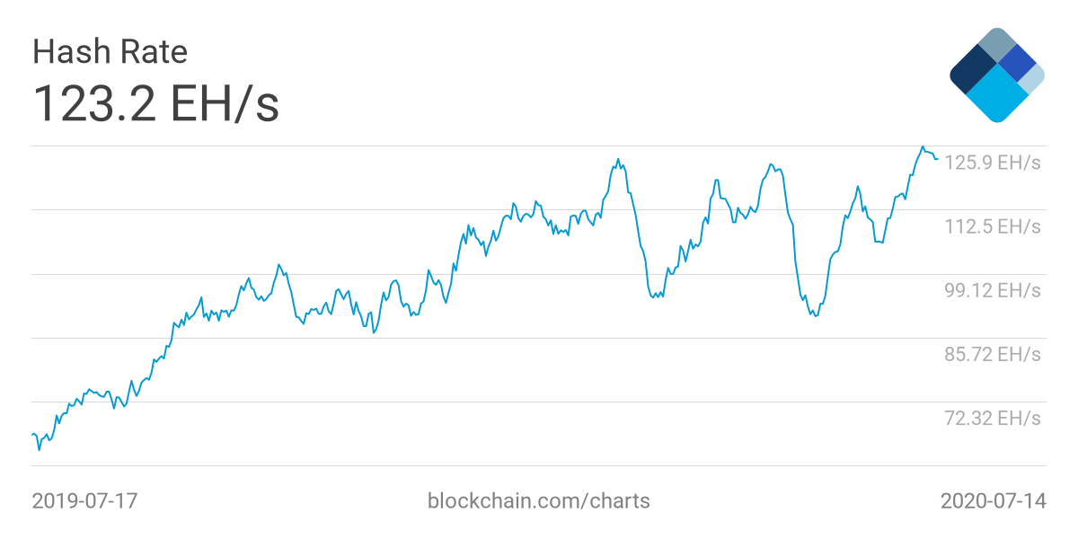 Data from Blockchain.com shows the hash rate of the Bitcoin blockchain network hit a new record high on July 8, reaching 125.99 million terahashes per second. It surpassed the previous all-time high set in the first week of March, moments before BTC fell below $3,600 on Black Thursday.